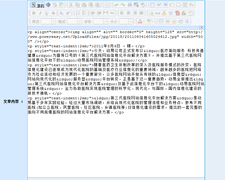 在動易后臺,進入“添加文章頁面”,在編輯器中輸入文字,添加圖片后,此時文章無格式: