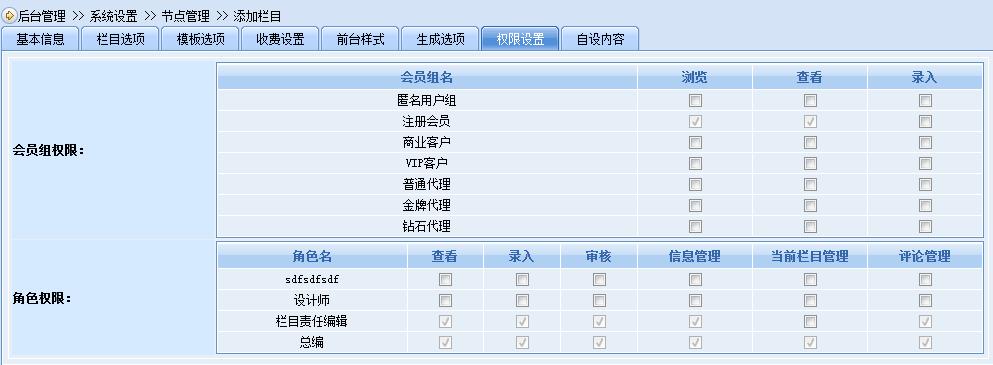 上圖是我們在新添加節(jié)點(diǎn)時權(quán)限設(shè)置的界面,可以看到我們可以分別給會員組和角色設(shè)置此節(jié)點(diǎn)的相關(guān)權(quán)限。會員組是前臺會員的權(quán)限,角色是后臺管理的權(quán)限。如果我們希望前臺的注冊會員能夠在會員中心添加此節(jié)點(diǎn)的信息,則可以在圖中勾上“錄入”權(quán)限(如下圖):