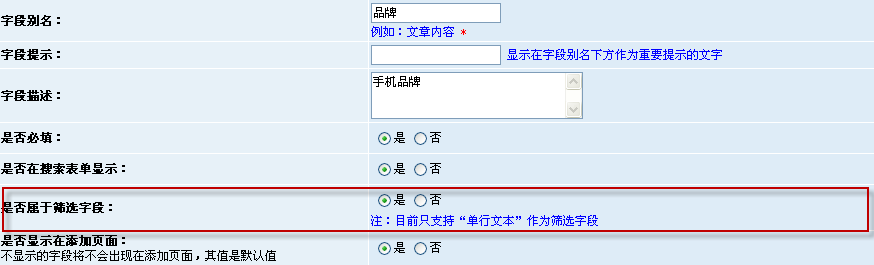 首先我們?cè)谑謾C(jī)商品模型中添加一個(gè)“品牌”字段,在選項(xiàng)中勾選添加前臺(tái)篩選: